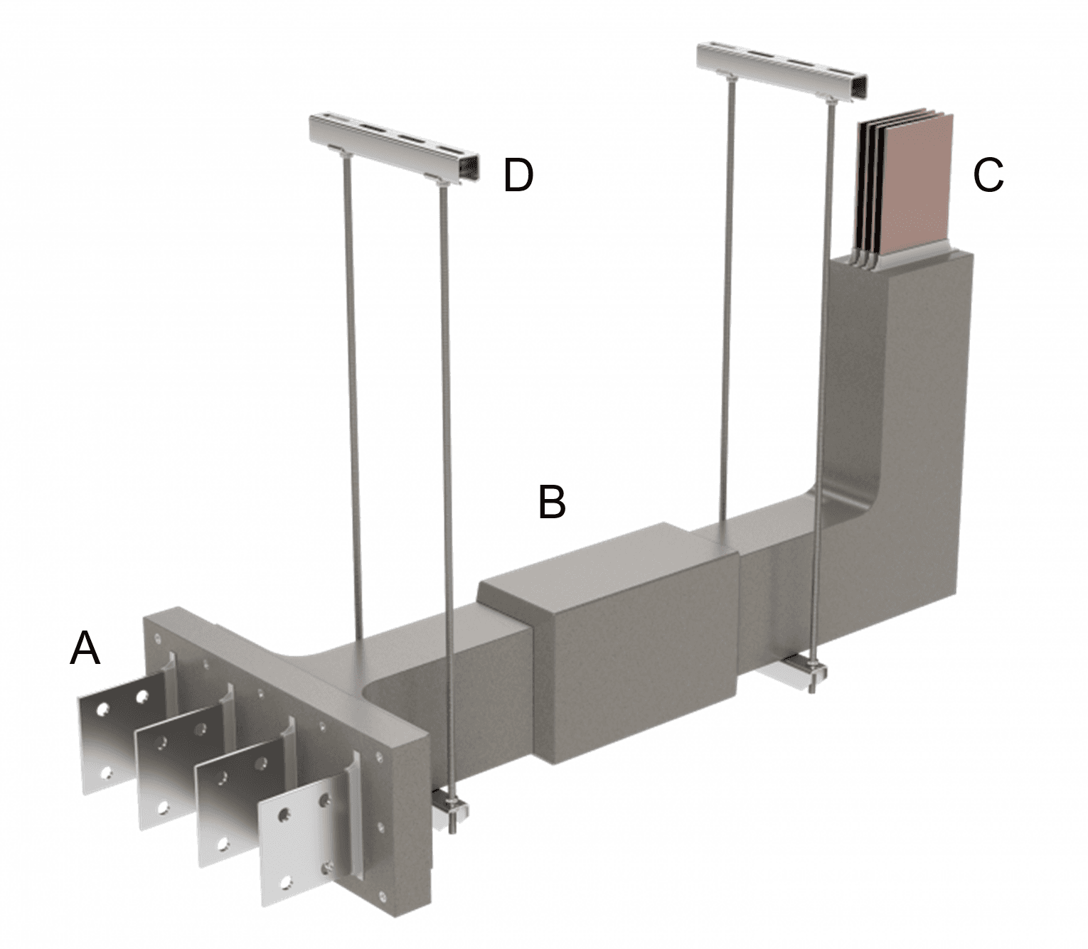 The image below shows some example sections. Ends are left exposed to allow jointing with a subsequent section (refer mark C) and then a mould is placed around the joint with a resin then poured around the joint area in situ. The jointed area is typically wider as shown by mark B. Mark A shows the final termination palms which would terminate to a switchboard or transformer. Mark D shows typical vertical mounted supports.